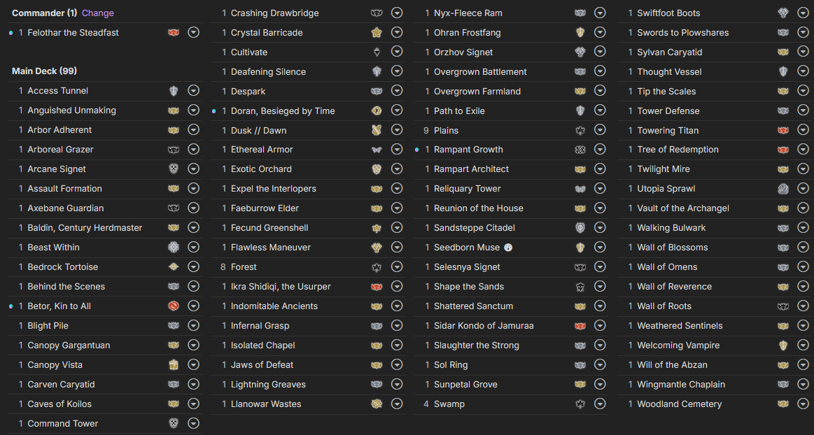 The deck balances creature-based acceleration with traditional land ramp for consistent early development. Cultivate, Rampant Growth, and Utopia Sprawl provide reliable access to all three colors while maintaining tempo. Artifact support such as Sol Ring, Arcane Signet, and Orzhov Signet complements the land package, ensuring smooth sequencing without overreliance on any single ramp vector.