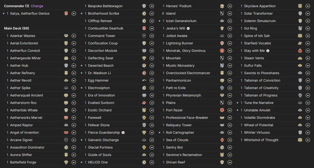 The deck converts accumulated resources into decisive board states through large artifact threats, extra combat pressure, and overwhelming value loops. Finishers such as Port Razer, Combustible Gearhulk, and scaled energy payoffs allow the deck to end games without relying on fragile combos.